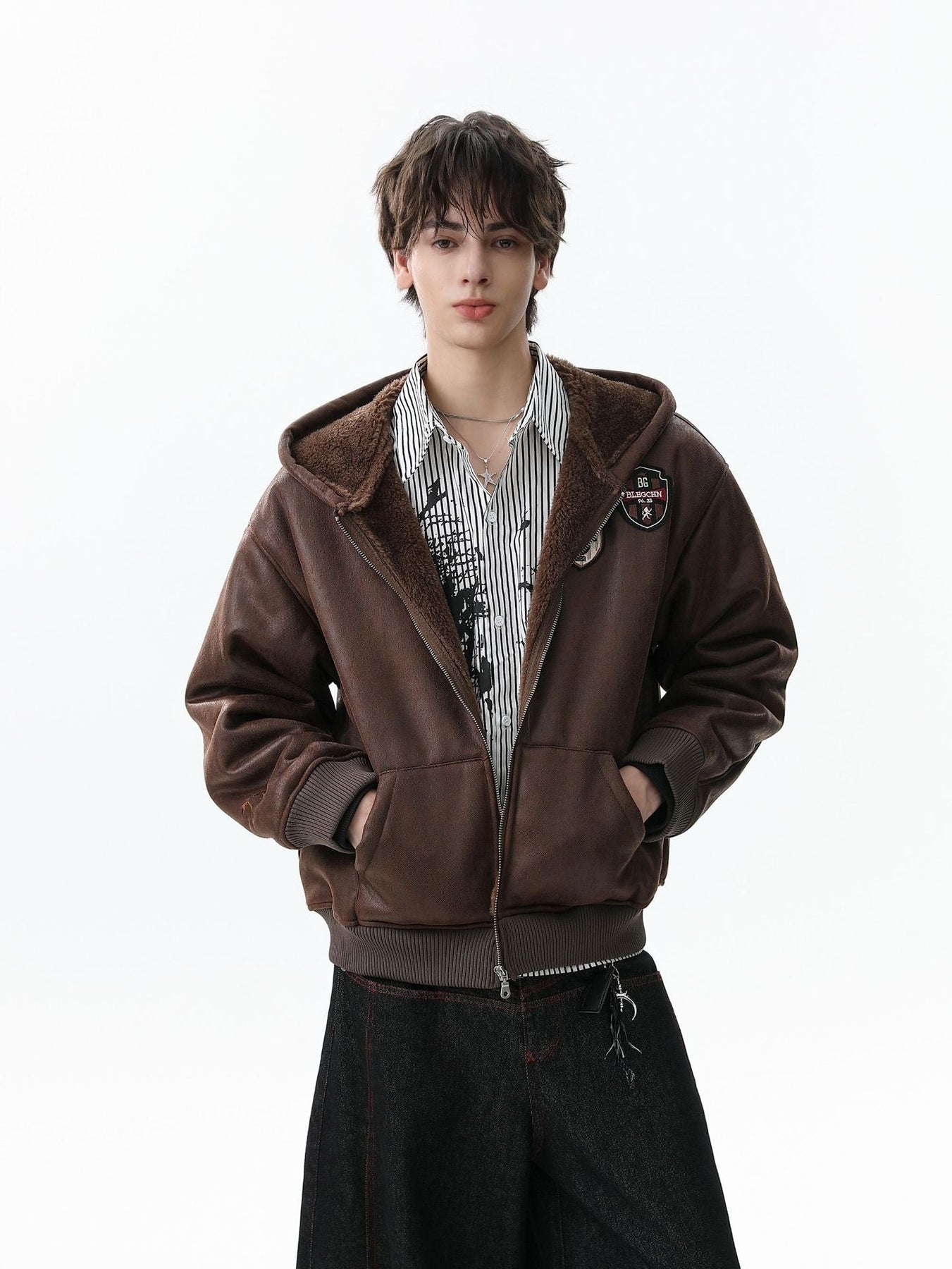 Ropasy Vintage Leather Badge Fleece-lined Hooded Zip Bomber Jacket
