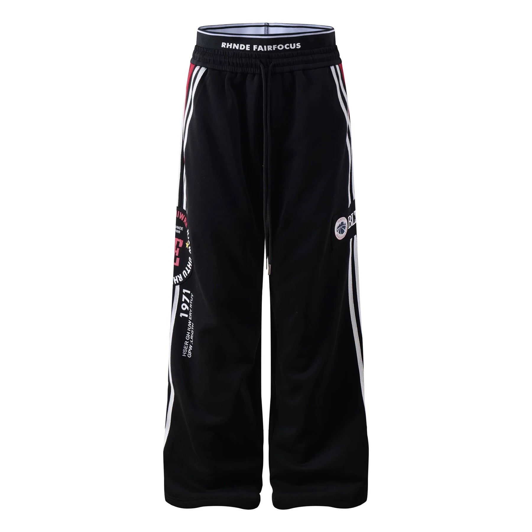 A playful streetwear staple with a double-layer waist and adjustable drawstring for a secure, comfy fit. Wide straight legs and bold letter print with side stripes give a confident, eye-catching look without fuss. Coated composite fabric keeps a soft hand while holding shape for everyday wear. Available in classic black and grey across five sizes for effortless layering and street-ready style.